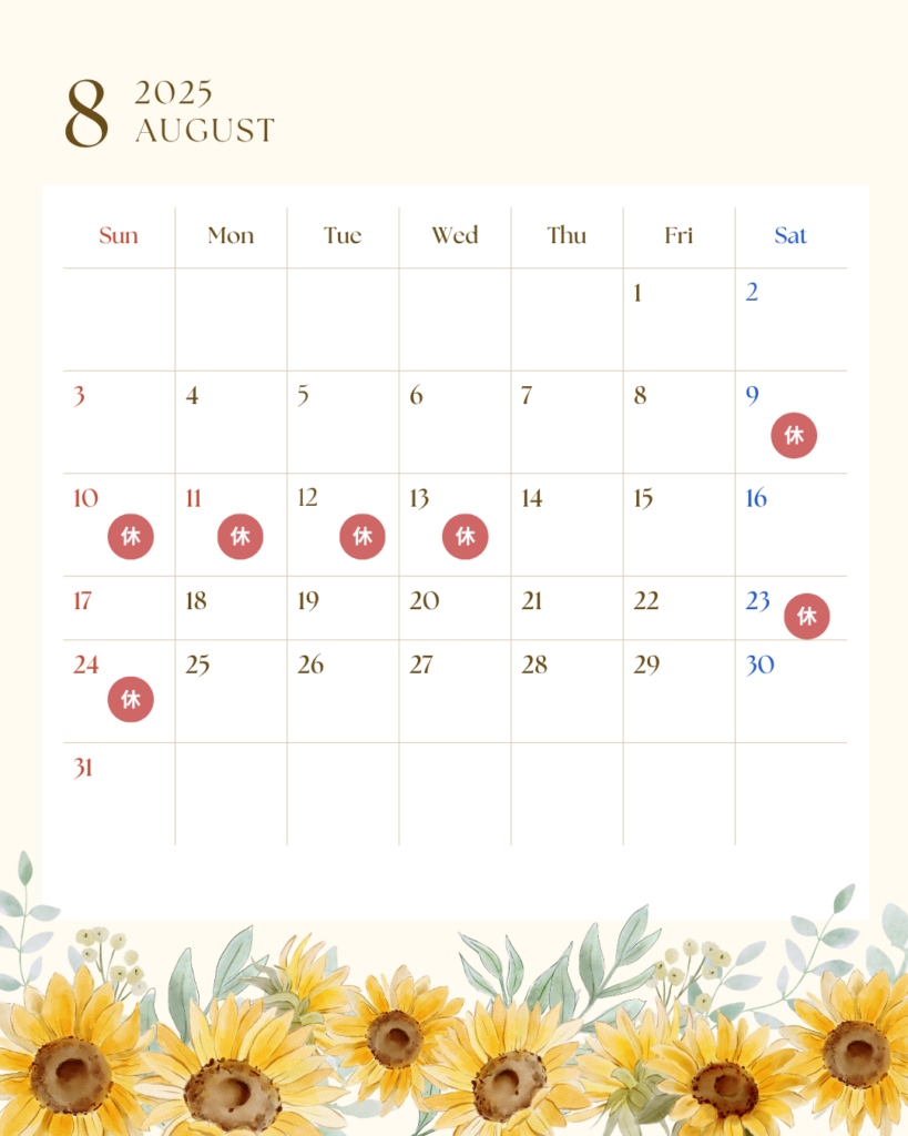 暑い、暑い、暑い💦8月になりました。8月のカレンダーです。今月は鹿児島育英館中学校野球部の全国大会に帯同する為、8月9日から13日まで長期お休みをいただきます。8月もよろしくお願いいたします。しかし、暑い💦
